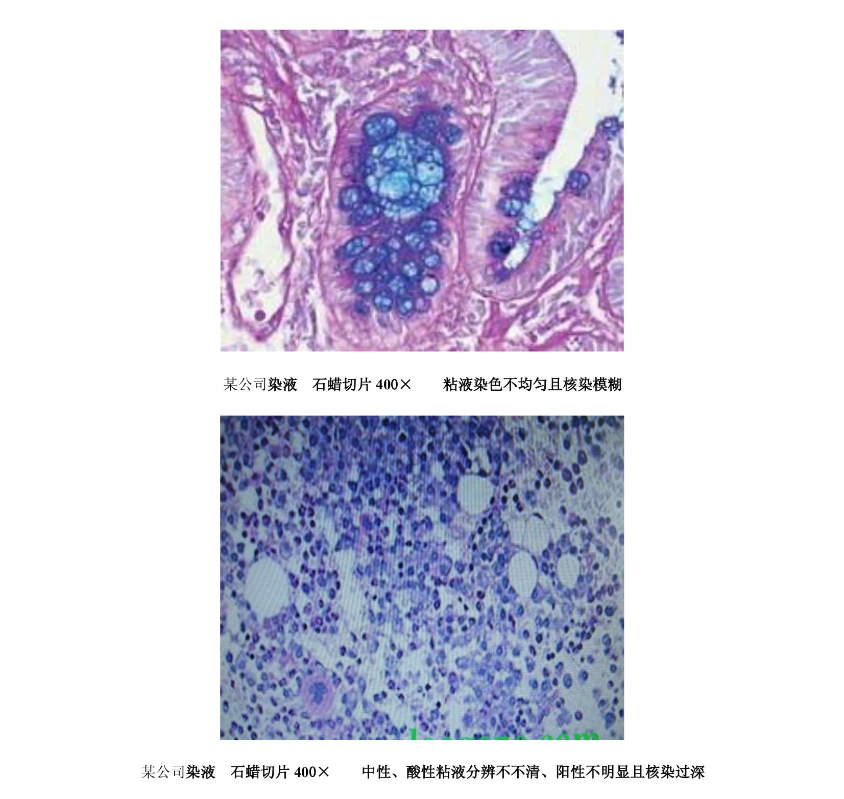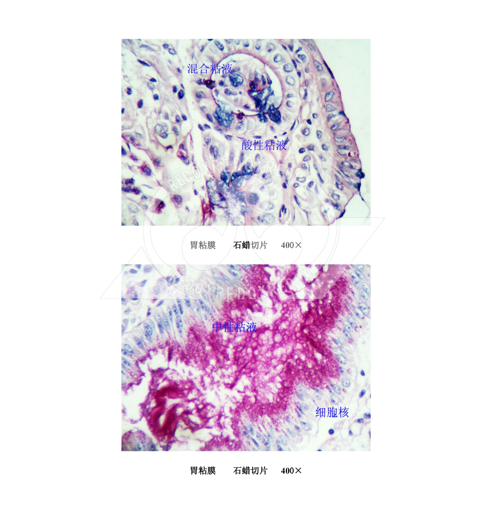 結果參考:酸性粘液物質(zhì)呈藍色,中性粘液物質(zhì)呈紅色,混合粘液物質(zhì)呈紫紅色,細胞核呈淺藍色。
